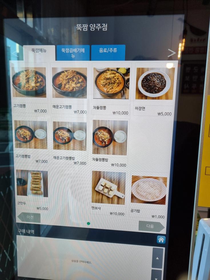 뚝짬 양주점은 키오스크주문이네요 요새 진짜 이런 자동화기계를 쓰는 식당과 상점들이 늘어나는거 같아요