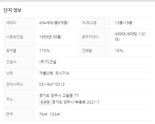 고읍동 TS푸른솔아파트1차는 494세대의 6개동 아파트로 1999년준공입니다 총주차대수는 499대로 세대당1대 맞춰져있고요 (주)TS건설사가 건설했고 개별난방 도시가스입니다 TS푸른솔1차아파트주소는 경기도 양주시 고읍동77, 도로명주소는 경기도 양주시 부흥로2021-7입니다 24평형과 33평형의 세대별면적을 보유중입니다