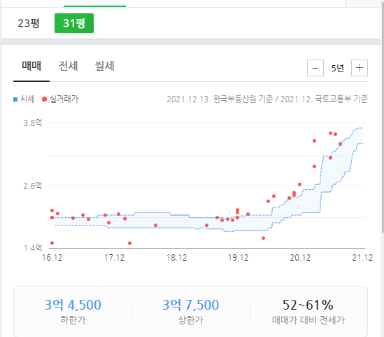 7호선 호재를 안고나서 31평형은 급격히 거래가 없는 모습입니다 2021년 6월에 3억6500만원 신고가갱신이 되었습니다