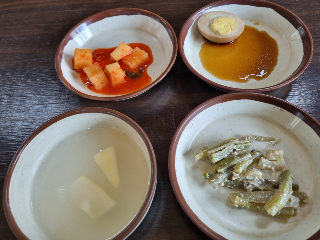 대접밥 깍두기 계란장조림반쪽 나물반찬 동치미가 나오네요