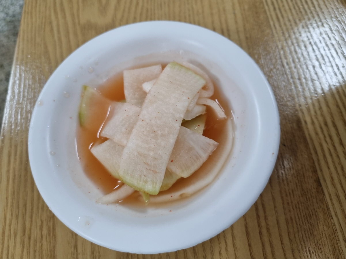 달콤해서 맛있는 무절임,, 평양냉면 입문자들이 힘든 걸레빤물처럼 느끼거나 텁텁할때 무절임이 환기를 잘 해줍니다