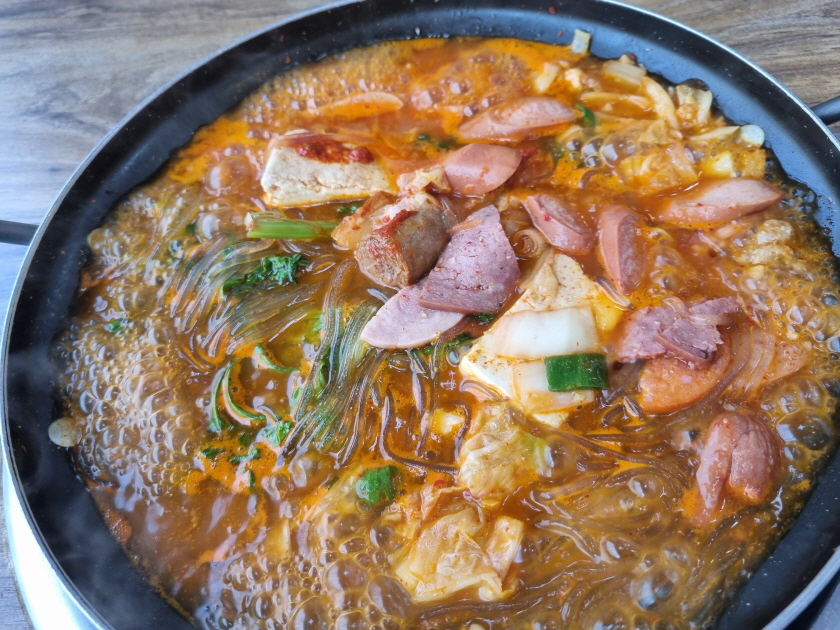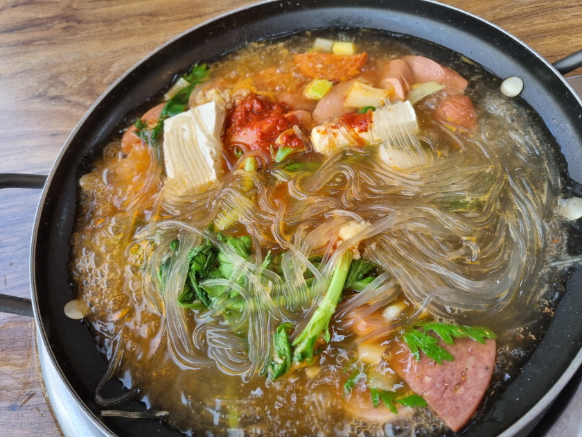 부대찌개에 당면사리 시키면 좀 조심해야할게 당면이 부대찌개육수를 그냥 빨아먹기 때문에 당면부터 건지거나 먹어야합니다