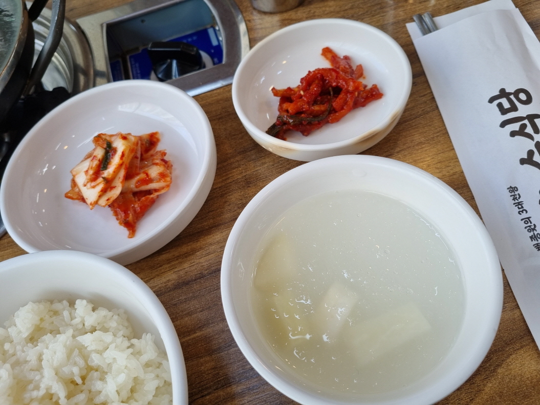 대접밥과 시원한 동치미, 배추김치와 무말랭이가 나오고 안심식당이라 그런지 수저는 따로 세팅