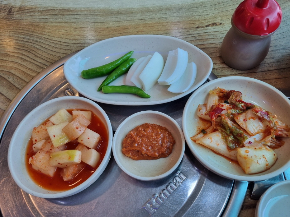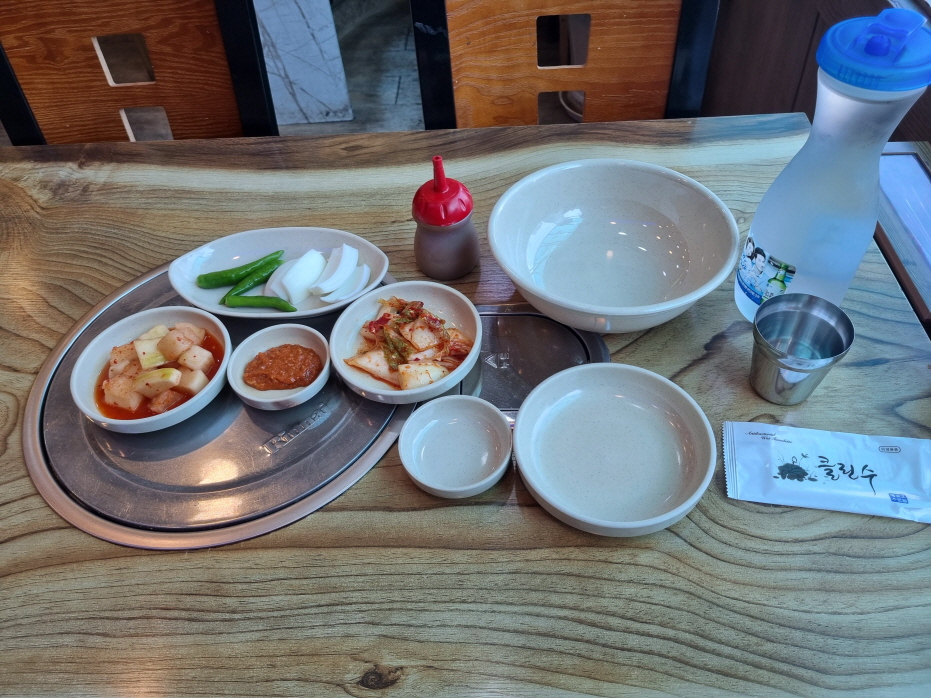 사대명가 기본테이블세팅 깍두기 배추김치 양파 고추 쌈장 겨자소스 뼈다귀담을 그릇들