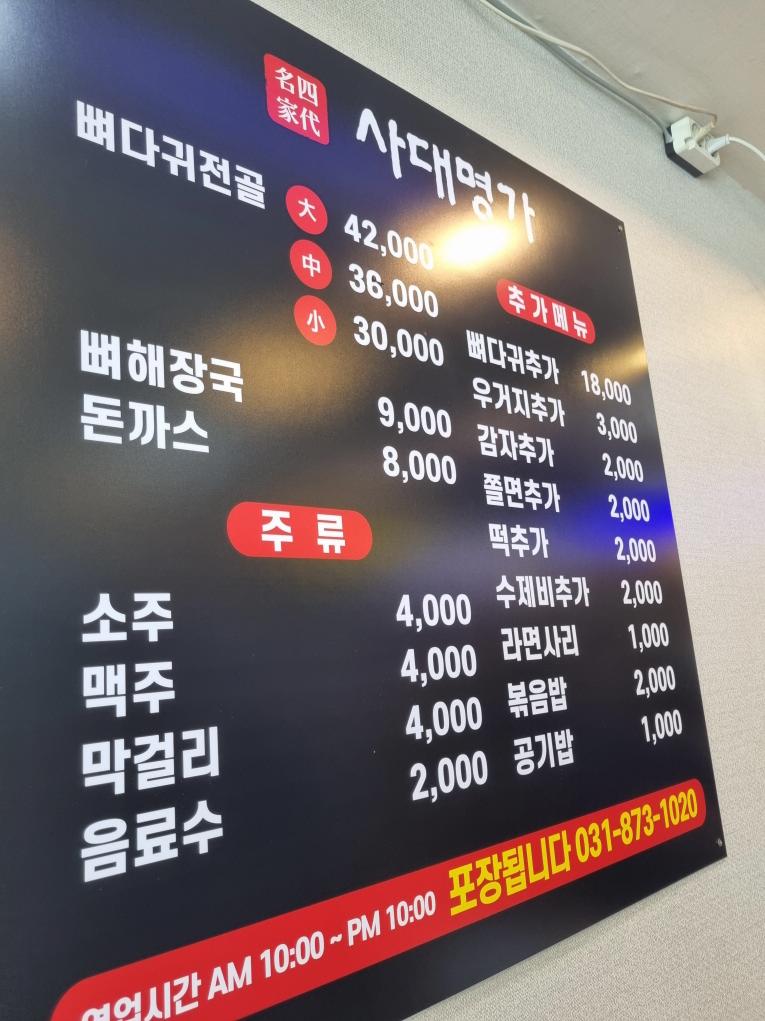 사대명가 메뉴판입니다