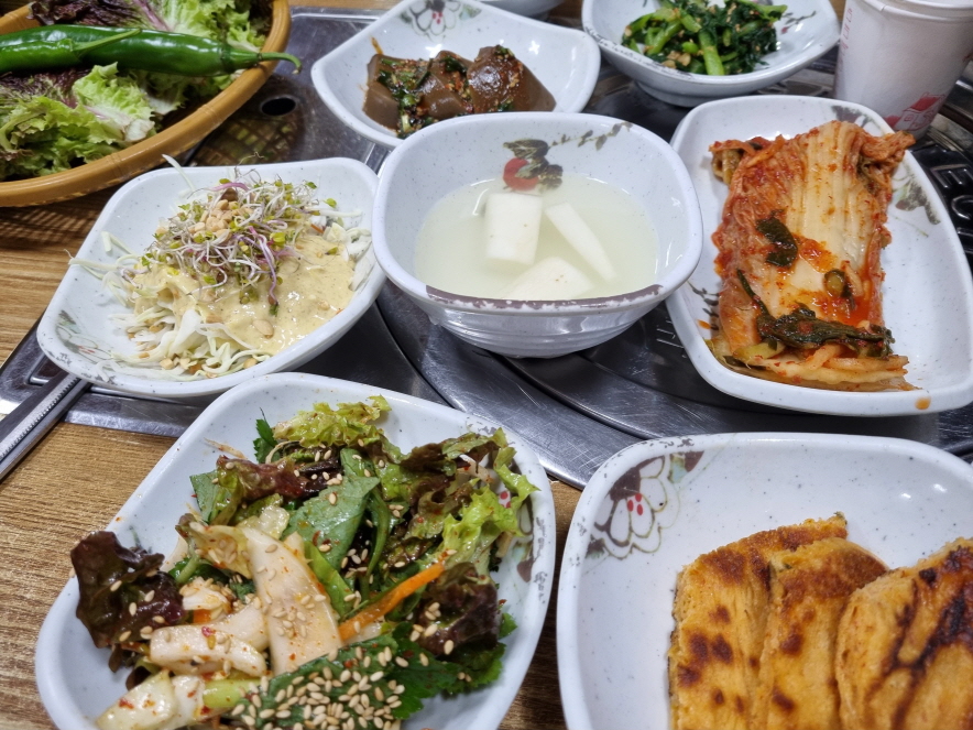 나물무침, 대파마늘쫑, 국내산김치, 김치전, 상추겉절이, 새싹샐러드, 동치미