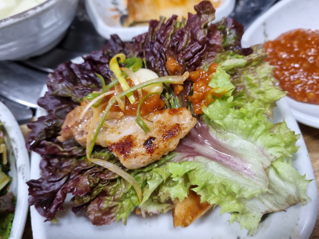 봉암식당 삼겹살과 상추쌈과 마늘과 대파겉절이