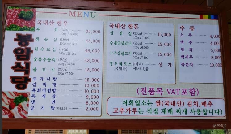 모범음식점이자 경기도으뜸식당이기도한 봉암식당