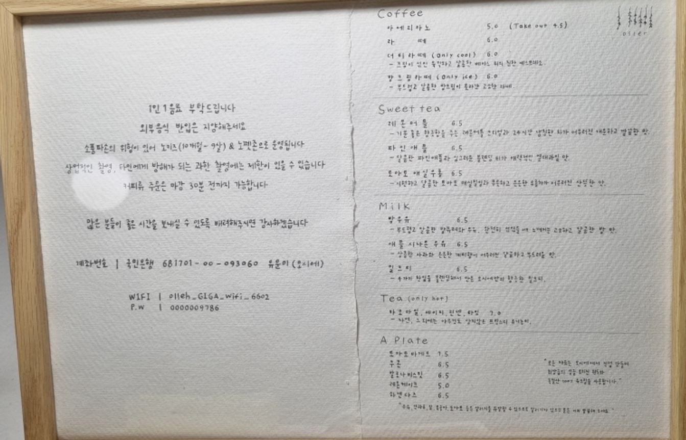 오시에에 오면 뭐 나도 블로그한다고 사진을 찍어서 할말은 없지만 진짜 사진찍기 좋은 인스타감성의 카페인건 확실하다 여성손님들이 대부분이고 나같은 남자, 특히 혼자 온 남자손님은 1년에 나 한명아닐까? 라는 생각이 들 정도..