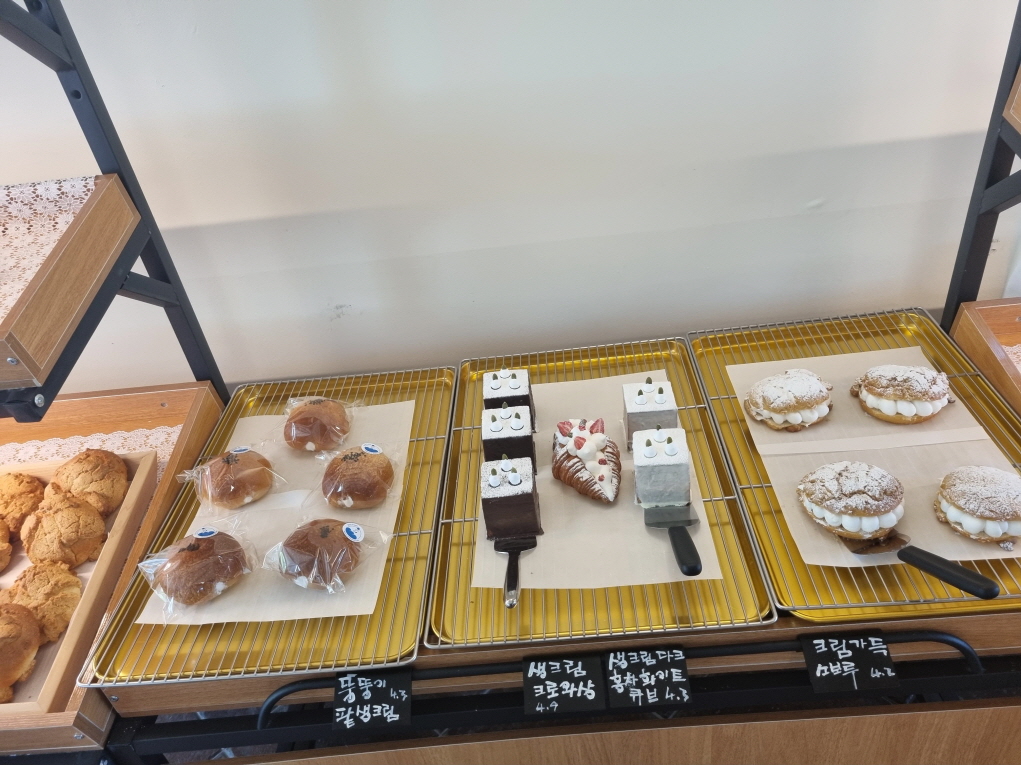 북한산큰숲제빵소 베스트는 뚱뚱이크림단팥빵, 큰숲크림모카, 크림치즈마늘, 소보루크림, 치아씨드호밀, 바삭찰빵, 열매데니쉬 등인데 시그니처빵들 말고도 소금빵이나 몽블랑이나 약간씩 달라지는것도 같고요