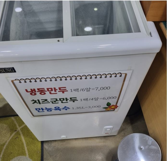 냉동만두 6알에 7천원 치즈군만두는 4알에 6천원 만능육수 3천원에 판매합니다