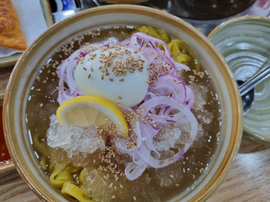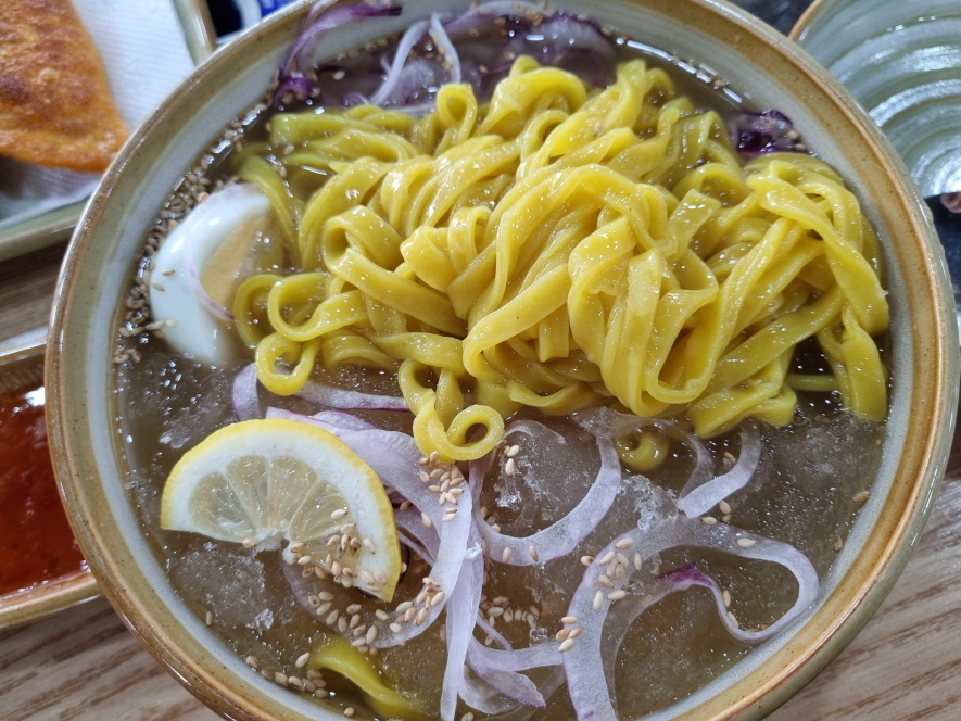 시원한 살얼음 가득한 육수와 양파 깨 계란 레몬조각 탱글탱글한 면이 아주 조화가 잘 이뤄져있습니다
