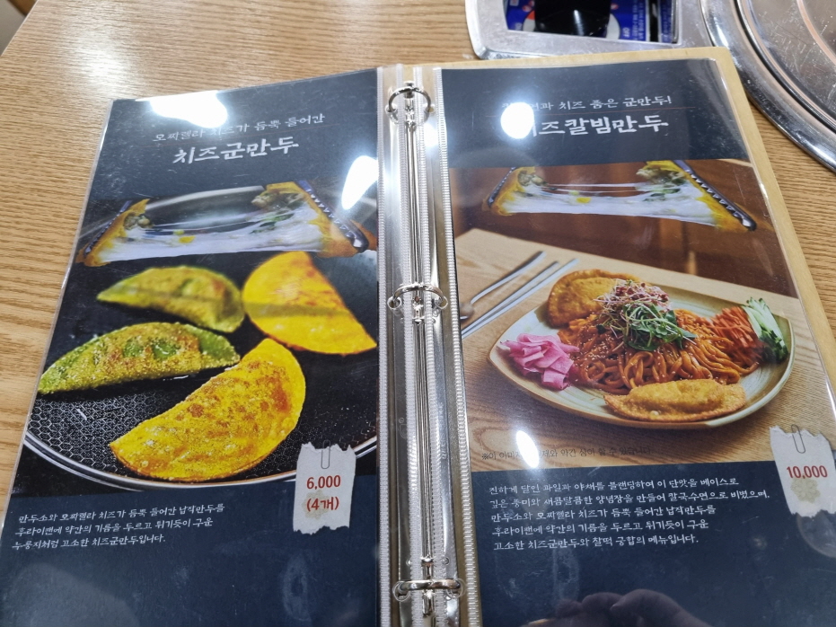 생만두샤브샤브와 얼큰만두전골이 주메뉴로 테이블마다 필수로 시키고요 서브메뉴로 냉칼면, 칼빔만두, 찐만두, 치즈군만두가 있습니다 대부분 만두샤브샤부와 만두전골 하나시키고 칼빔만두나 치즈군만두를 서브로 시키는듯합니다