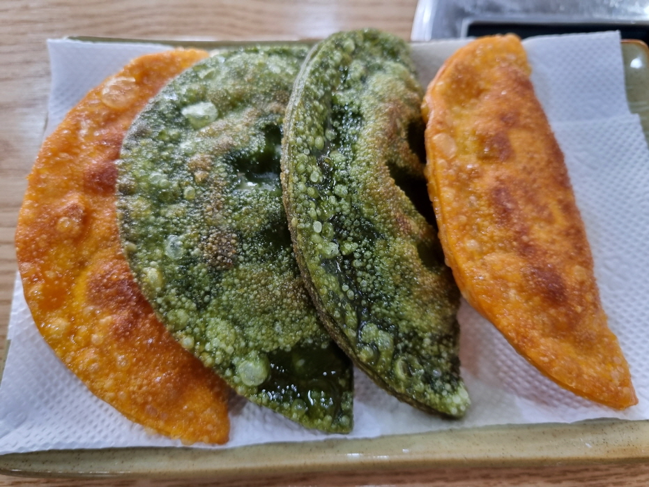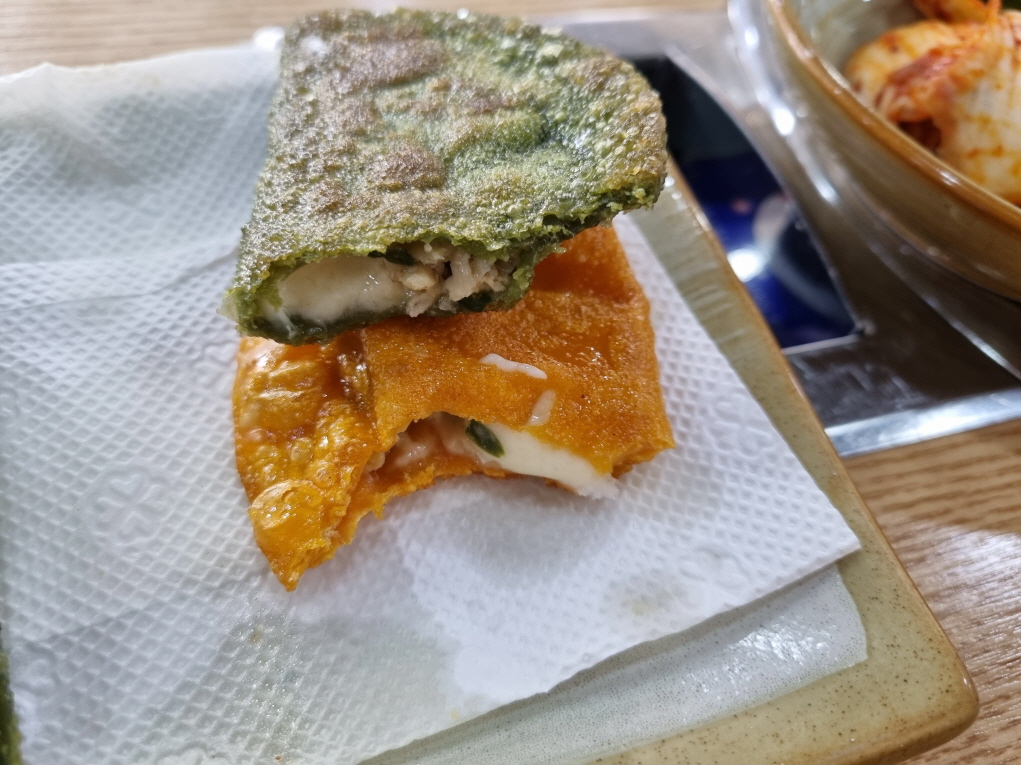 납작만두를 모짜렐라치즈와 함께 튀기듯이 구운 이 치즈군만두도 일품입니다...치즈칼빔만두와 만두전골은 저번에 먹어서 오늘은 냉칼면과 치즈군만두를 주문했습니다