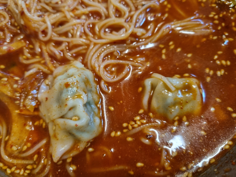 먼저 거쳐간 선배님들의 노하우대로 물만두를 비빔국수에 빠트려서 먹으니 역시 별미는 별미..