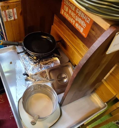 가게입구에는 주문하고 기다리는동안 무료로 또 셀프로 만들어먹을수 있는 셀프 메밀전 바가 준비되어 있습니다