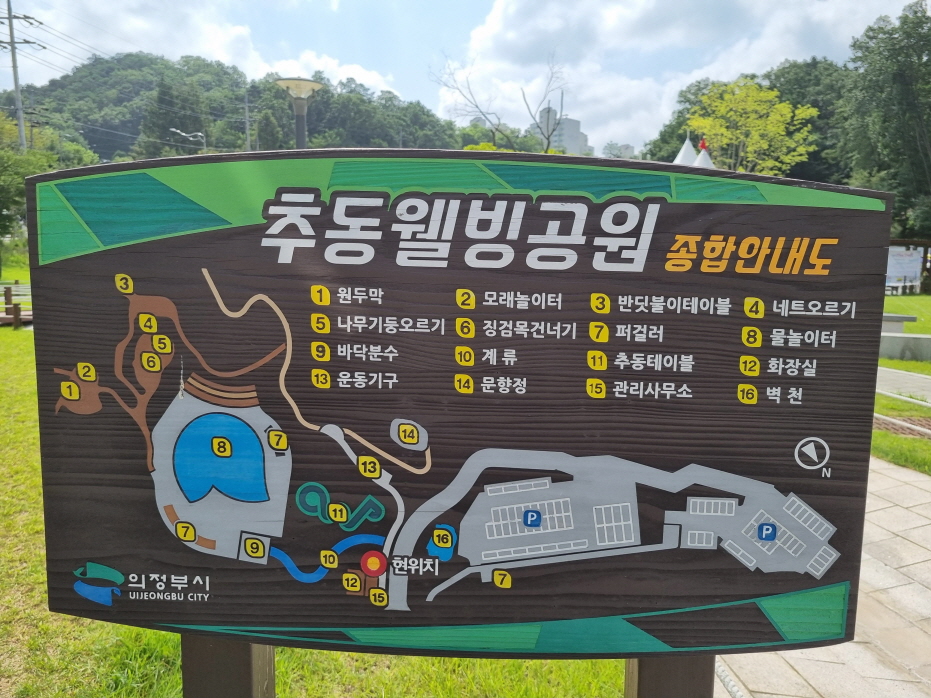 무료로 주차가능합니다 크게는 추동근린공원은 의정부시에서 가장 크고 넓은 규모의 산지형공원으로 가벼운 등산과 산책을 즐길수 있으며 전망대, 해날광장, 도락화원, 신곡배드민턴장, 의정부천문대, 야외학습장들이 있으며 의정부소풍길과 행복길 1코스로 경기북부청사, 추동배드민턴장, 의정부과학도서관 등에서 진출입이 가능하며 맞은편에 추동웰빙공원은 어린이물놀이터와 주차장, 휴식공간, 어린이모험놀이터등 조금 더 작게 구성되어있는 공원입니다