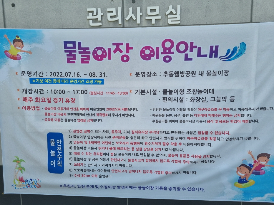 의정부시 최대의 무료어린이물놀이장 추동웰빙공원 물놀이장 발물놀이터는 2022년 7월16일부터 8월31일 전후로 운영될 예정이며 개장시간은 오전10시부터 오후5시까지 점심시간 11시45분서부터 1시까지, 비가 오는 날 우천시나 매주 화요일은 휴장합니다 수심30cm 이하로 안전하게 아이들이 물놀이를 즐길수 있는 수심을 유지하며 안전요원도 2명이 근무하며 관리합니다 간단한 물놀이복장과 아쿠아슈즈가 있으면 더 좋을거 같습니다 무료대여도 해주는거 같아보이긴했습니다만..