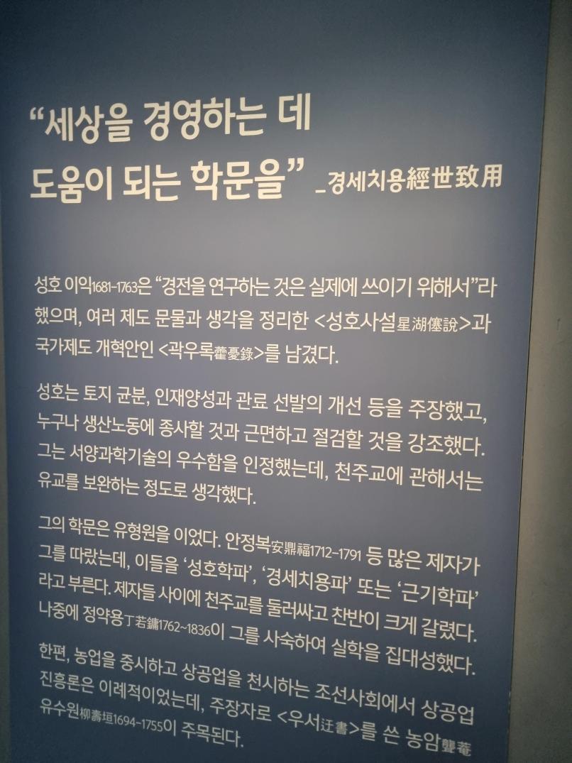 세상을 경영하는데 도움하는 학문, 경전을 연구하는 것은 실제에 쓰이기 위해서라는 정신으로 성호이익선생은 성호사설과 곽우록을 남겼고 유형원과 안정복으로 이어져 성호학파 근기학파로 발전했습니다