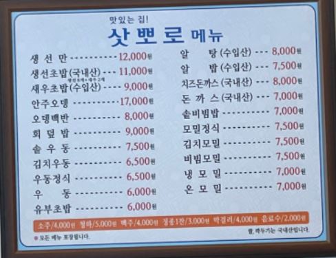 삿뽀로우동초밥모밀전문점 메뉴판과 가격입니다