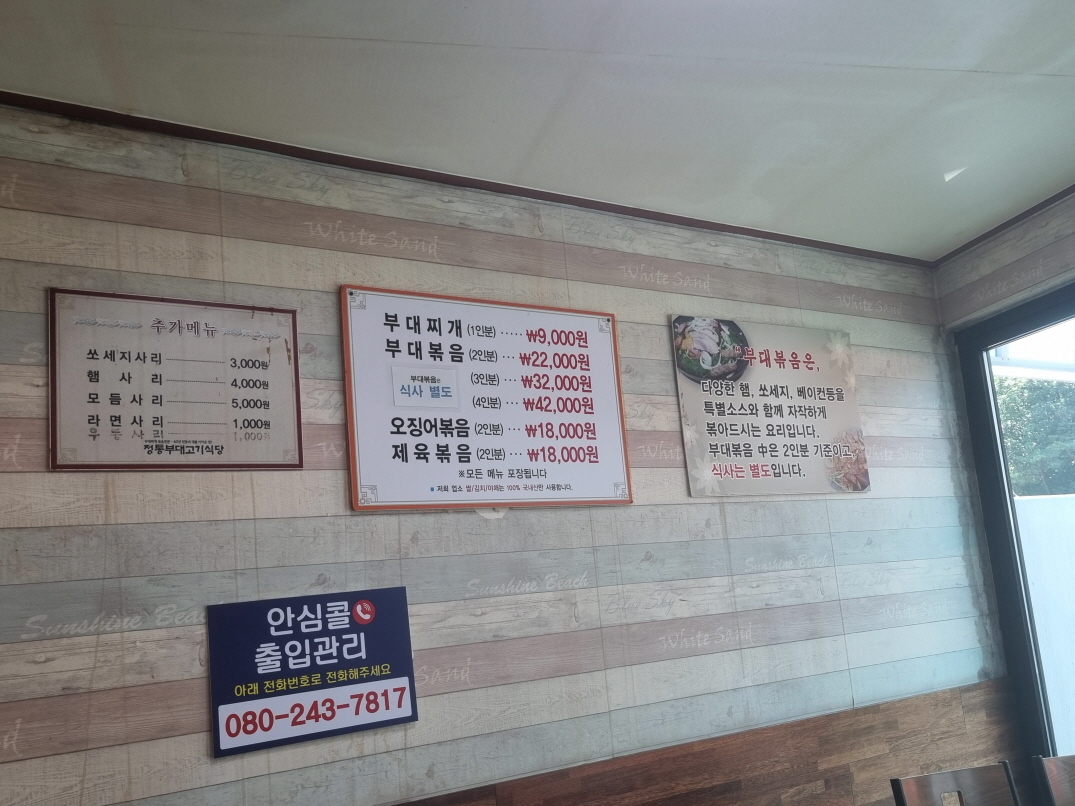 부대찌개 1인분 9천원 부대볶음은 2인분부터 주문가능하고 2인분 22000원 3인분 32000원이런 식입니다