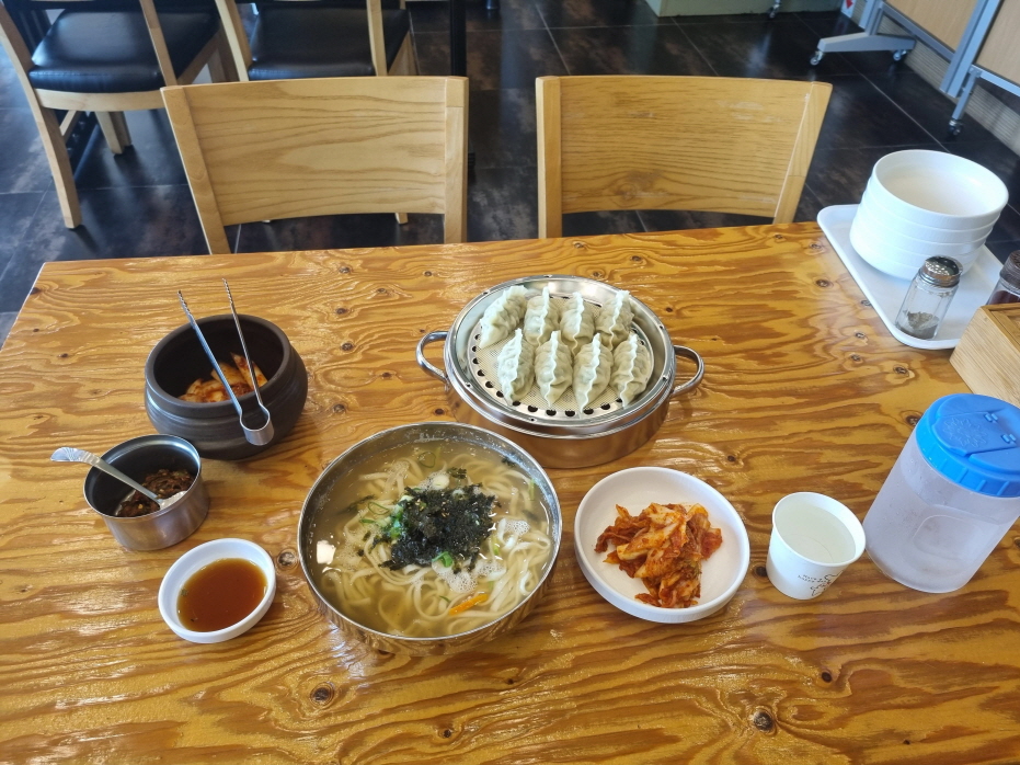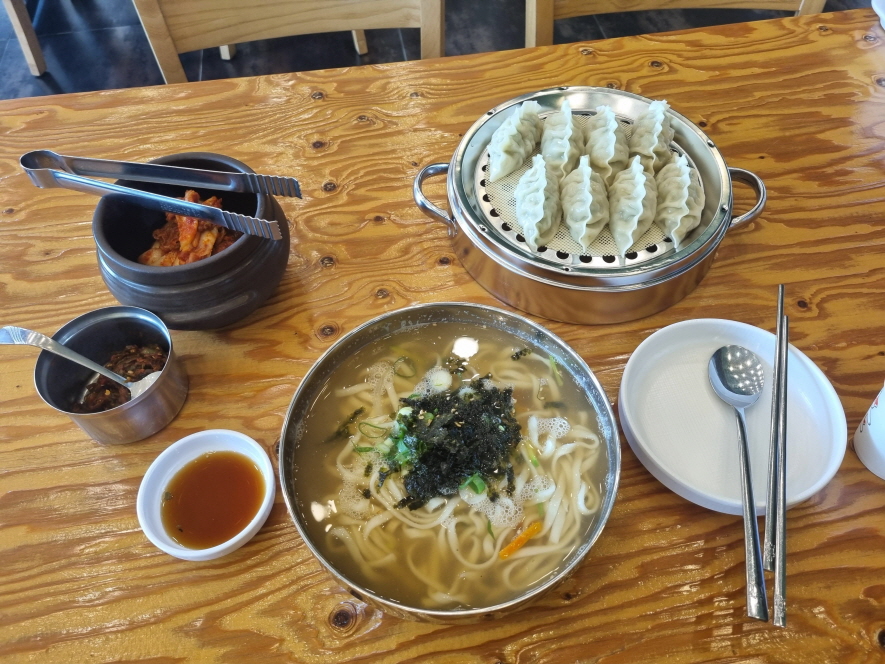 버들골칼국수 기본테이블세팅과 곧바로 나온 버들골칼국수와 만두 한판입니다