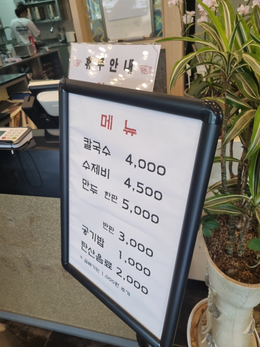 칼국수 4천원 수제비 4500원 만두 한판 8개 5천원 4개 반판 3천원 공기밥 천원입니다