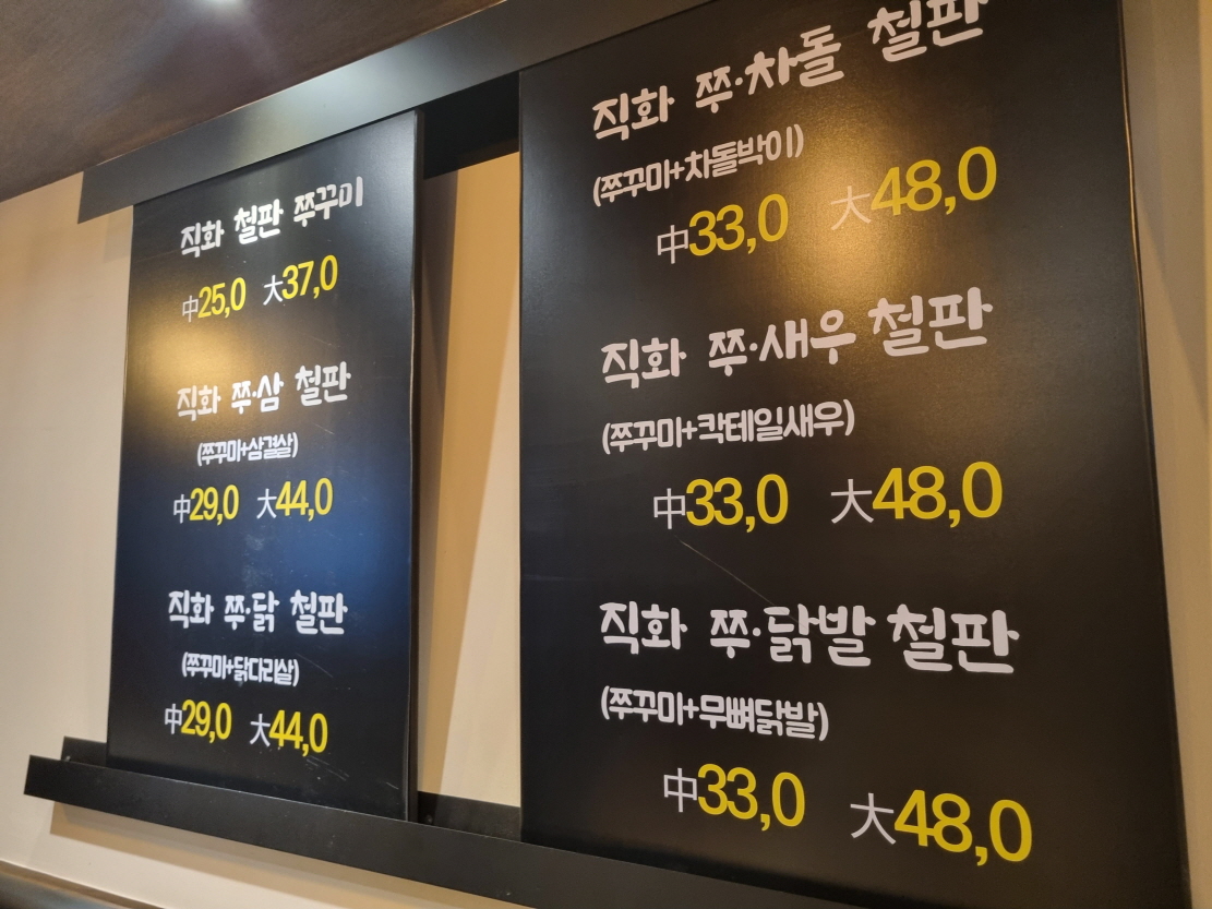 직화철판쭈꾸미 중 25000원 대37000원, 직화 쭈꾸미삼겹살 쭈삼철판 중29000원 대 44000원
