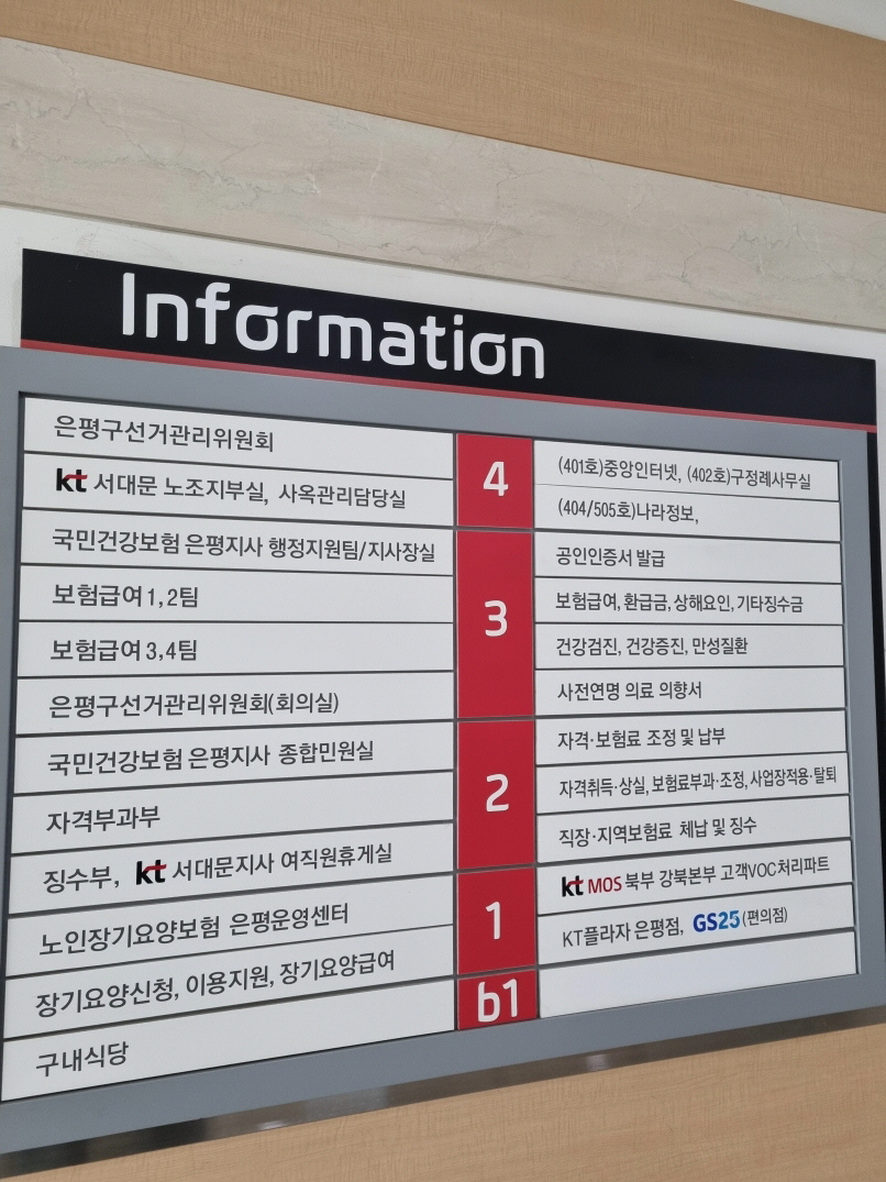 4층 건물로 은평구선거관리위원회, 국민건강보험 은평지사, 은평구선거관리위원회, 노인장기요양보험 은평운영센터, KT플라자 은평점, KT MOS등 다양한 사무실들이 입점해있어서 구내식당이 운영되는거 같아요