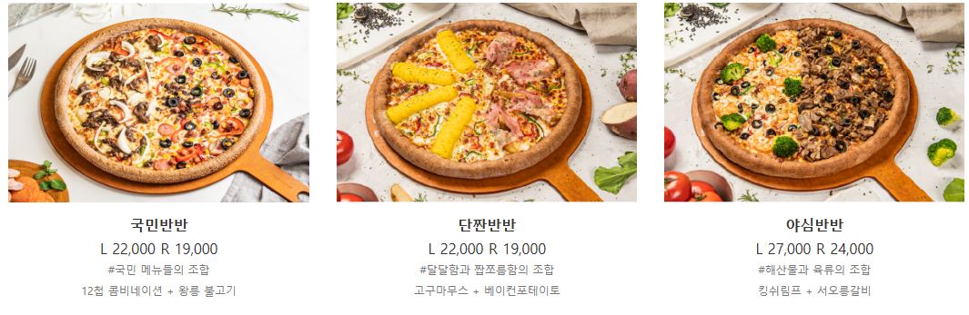 콤비네이션과 왕릉불고기가 합쳐진 국민반반, 고구마무스와 베이컨포테이토가 합쳐진 단짠반반, 킹쉬림프와 서오릉갈비피자가 합쳐진 야심반반등 반반피자도 인기있는듯요