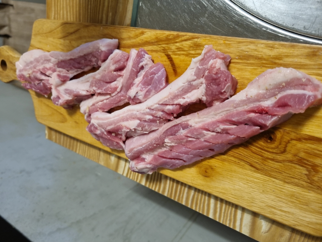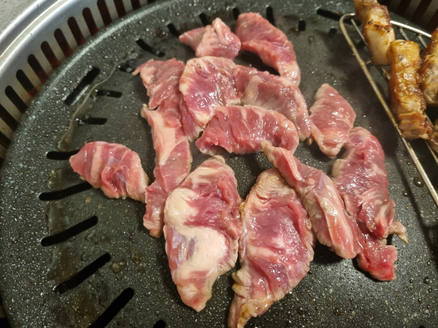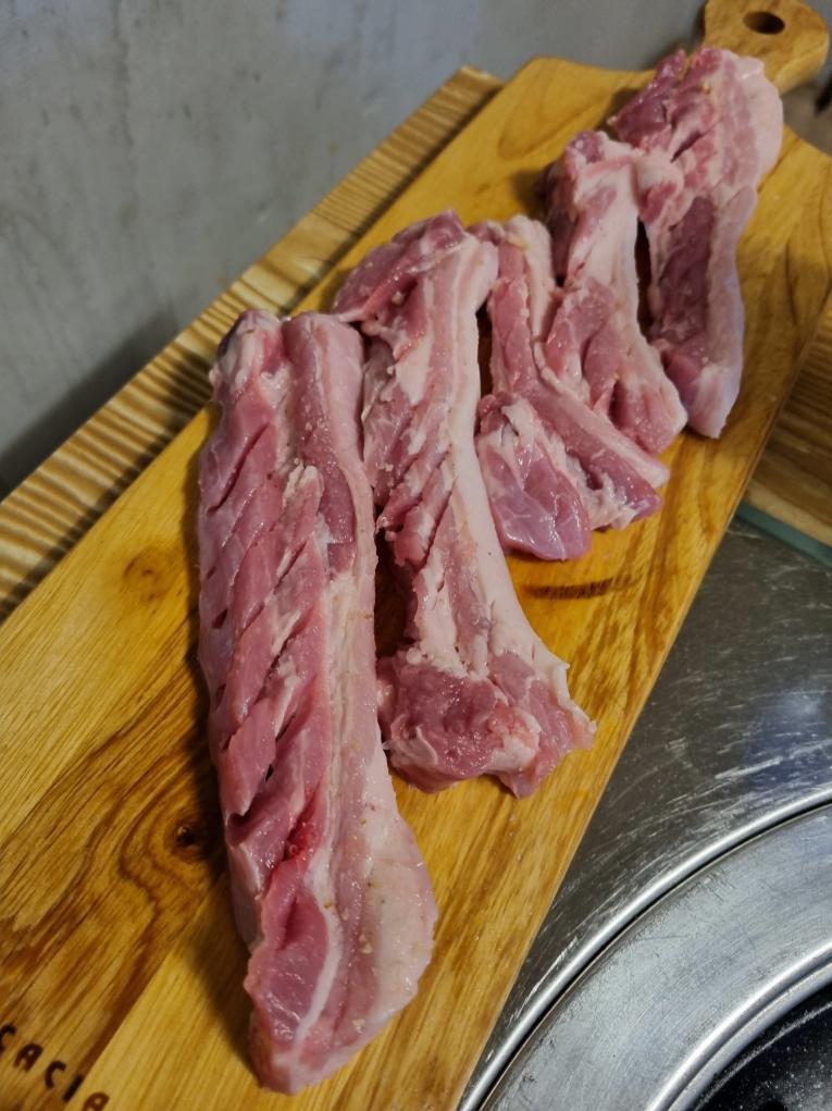 먼저 깔리는 삼겹살...손질도 잘 되어 있고 고기도 괜찮아 보입니다