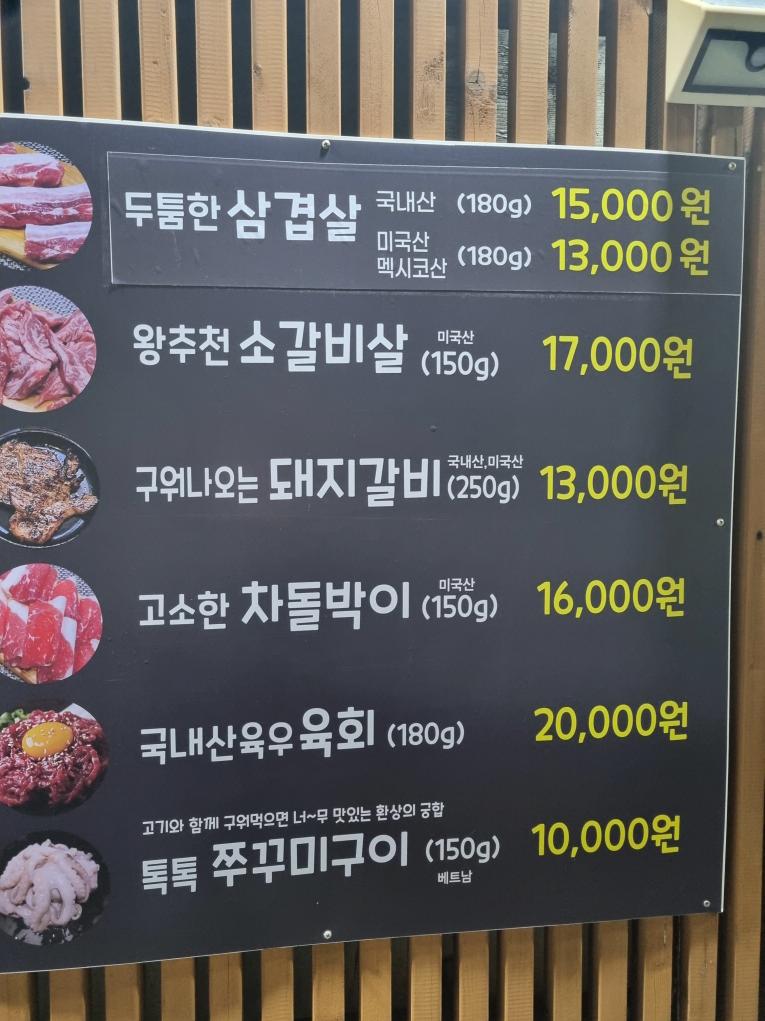 나름 가격도 괜찮은거 같은데요 국내산 삼겹살과 미국산 멕시코산 삼겹살도 있고 소갈비살하고 구워나오는 돼지갈비, 차돌박이, 육회, 쭈꾸미까지 다양한 고기와 메뉴들이 있습니다