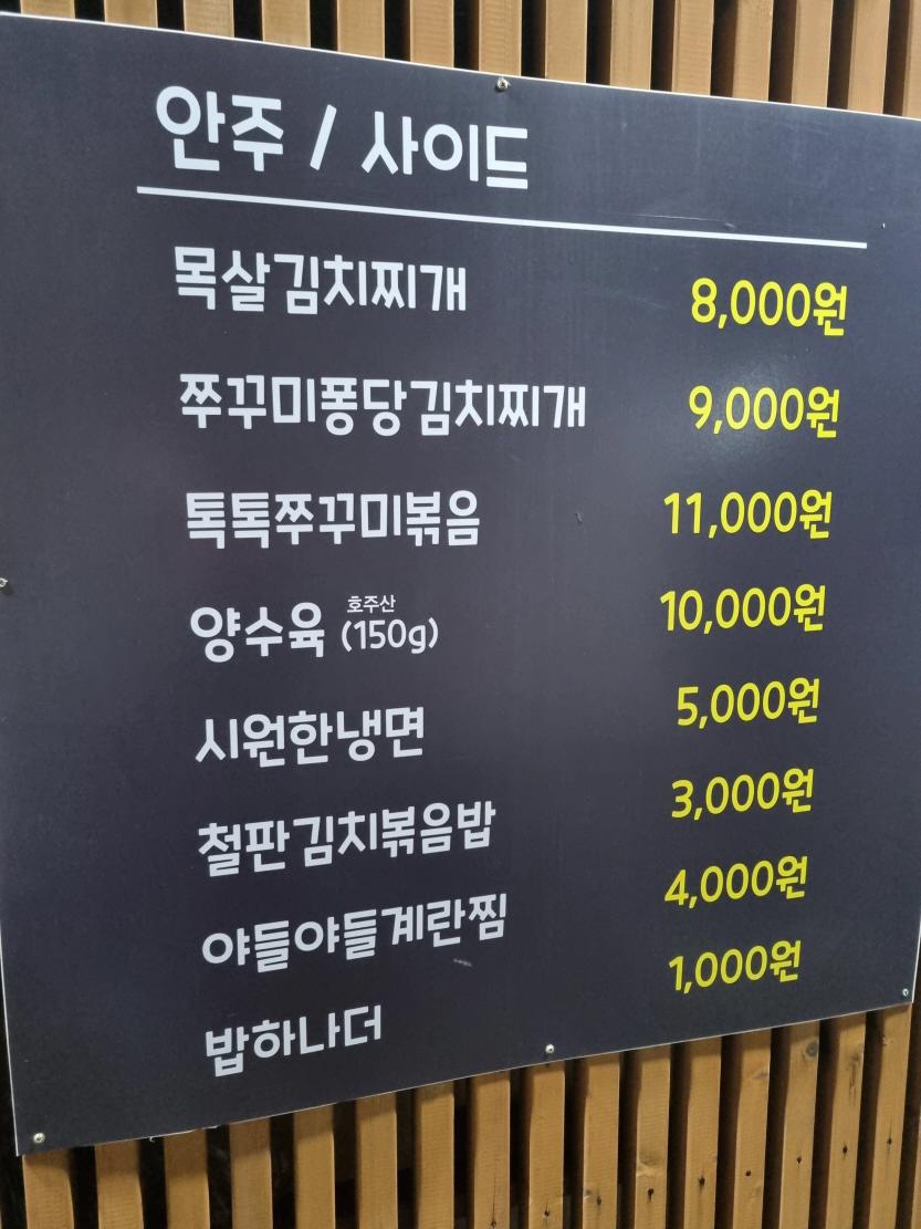 사이드메뉴로 김치찌개, 쭈꾸미김치찌개, 쭈꾸미볶음, 양수육, 냉면, 김치볶음밥, 계란찜이 있고 점심메뉴로 소고기국밥, 제육볶음, 오징어볶음 등등이 있고 1인 직화돼지갈비도 있다고 합니다 ..