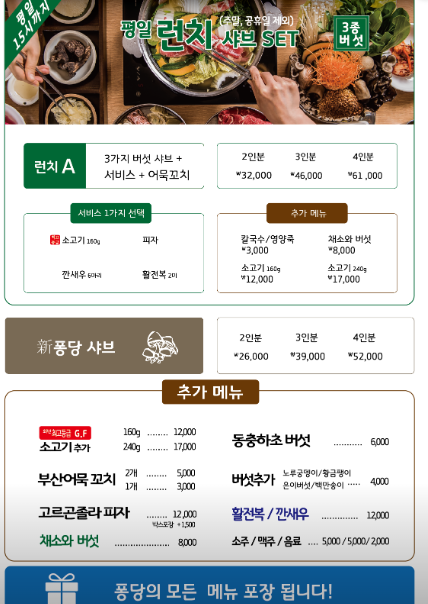 등심퐁당샤브퐁당 포천송우리본점 메뉴판과 가격이예요