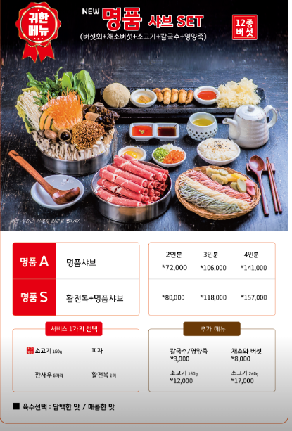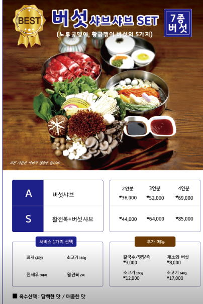 월남쌈샤브샤브1종세트가 1인분에 23000원꼴이고 프리미엄 명품샤브12종버섯세트가 1인분에 36000원꼴입니다