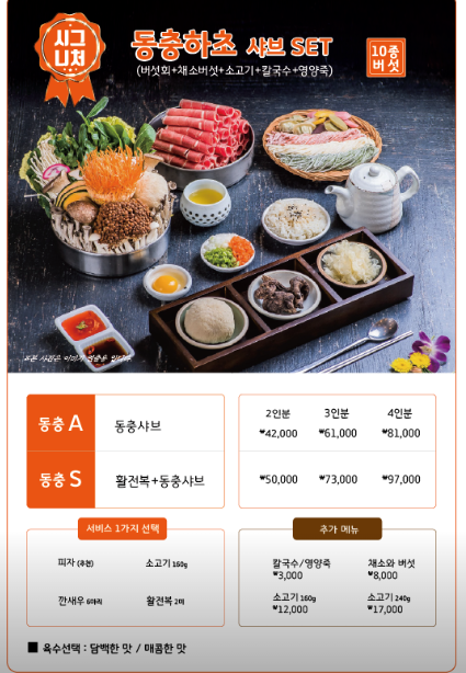 시그니처메뉴인 동충하초샤브샤브 10종버섯세트가 1인당 2만원꼴입니다
