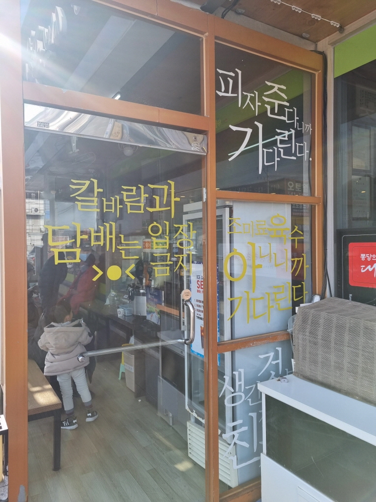 옆에 웨이팅이 힘들어서 달래는 손님이나 아이들을 위해 재밌는 문구도 있습니다 피자준다니까 기다린다..등등