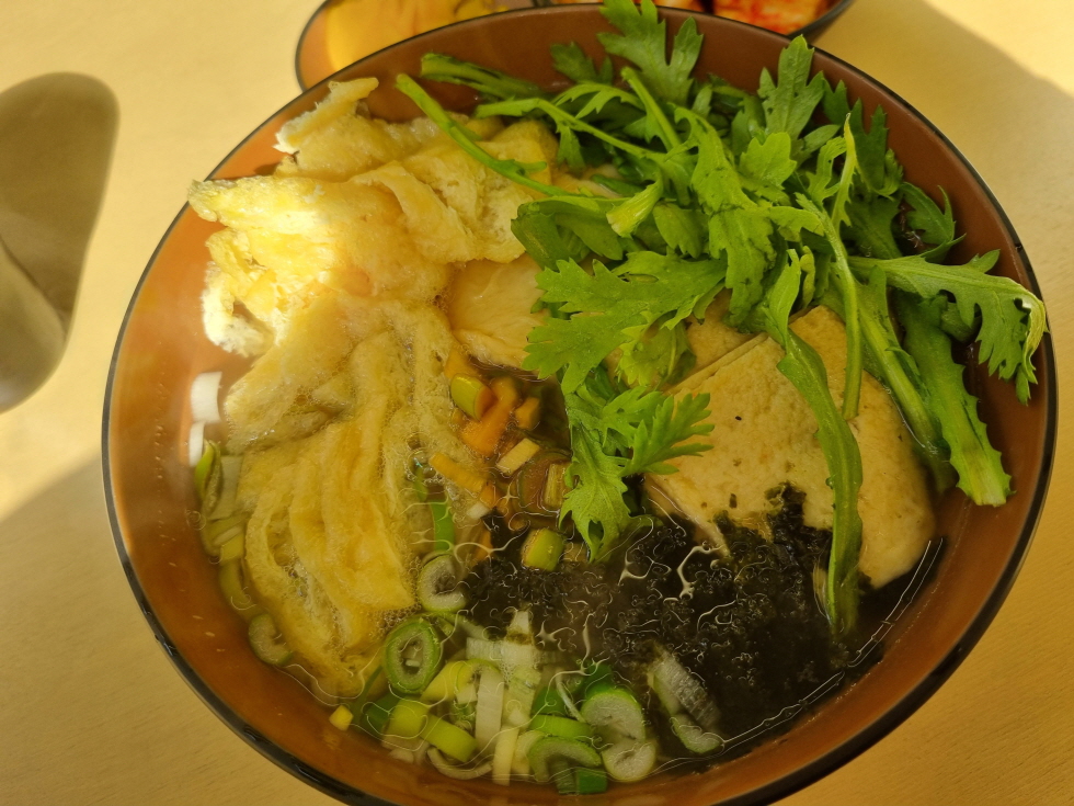 유부와 쑥갓, 어묵, 파, 김가루, 간장양념살짝이 얹어져서 나옵니다