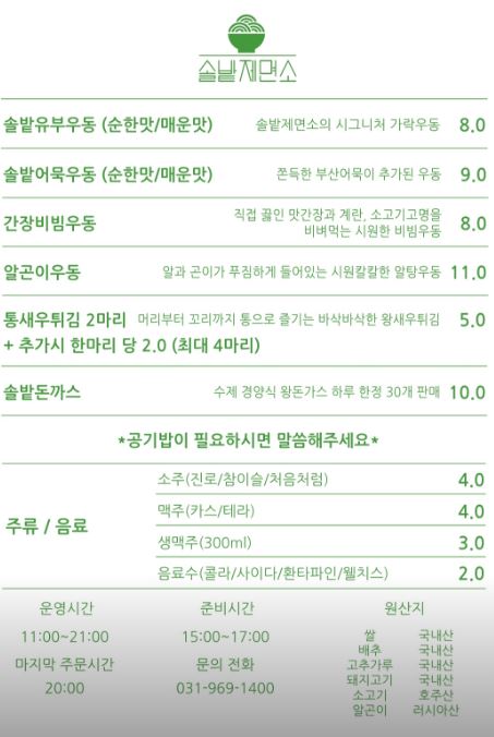 솔밭제면소 메뉴판과 가격입니다