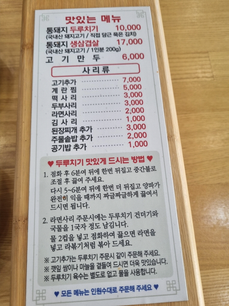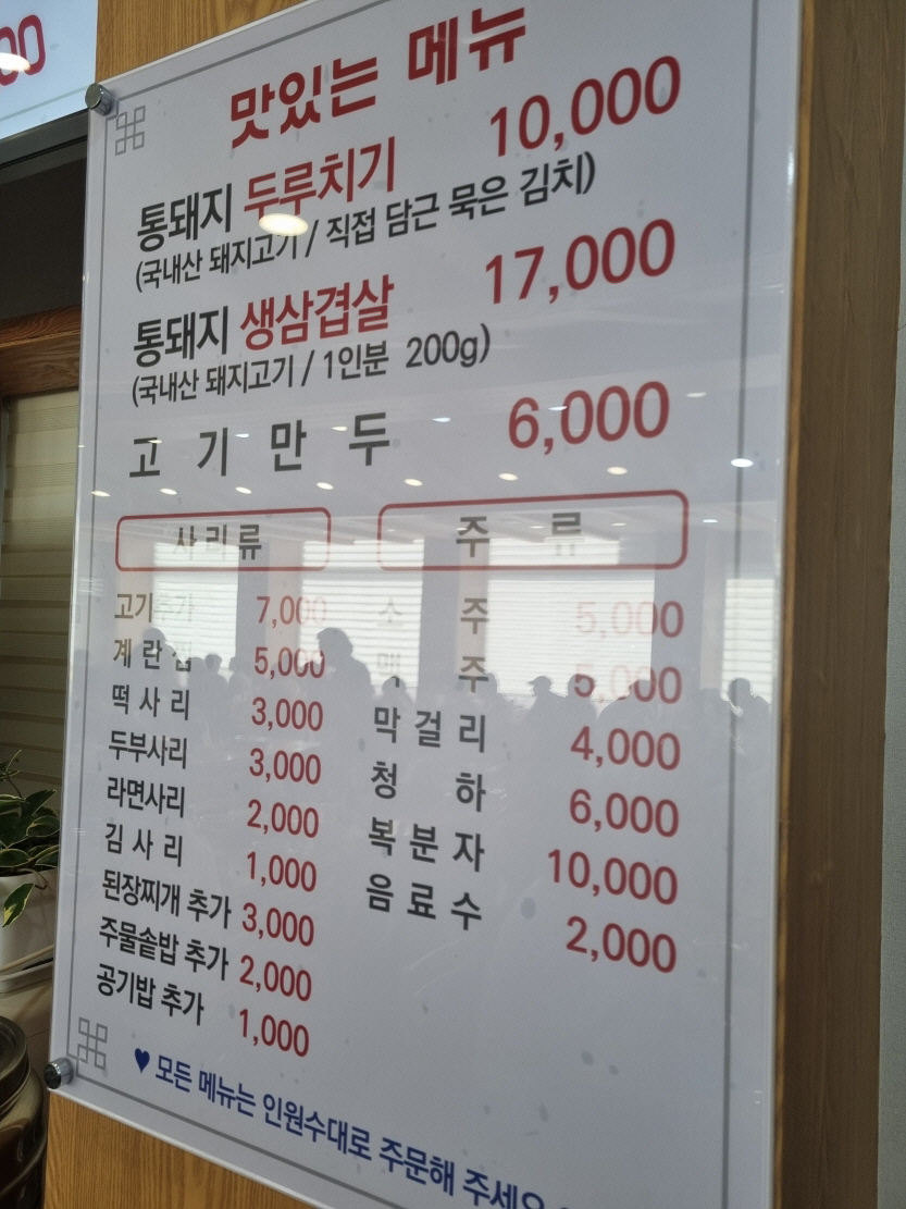고기만두 6천원 계란찜5천원 된장찌개추가 3천원 주물솥밥 추가 2천원 고기추가 7천원 다양한 두루치기사리까지