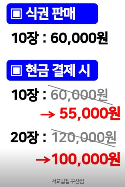 또 식권판매로 안그래도 한끼 6천원으로 싼데 현금결제 조건으로 식권 10장을 사면 5500원 20장을 사면 5000원...
