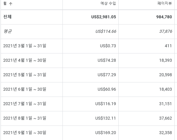 아무튼 2년간 구글에드센스로만 2981달러의 수익을 냈습니다 월평균 114달러의 수익..