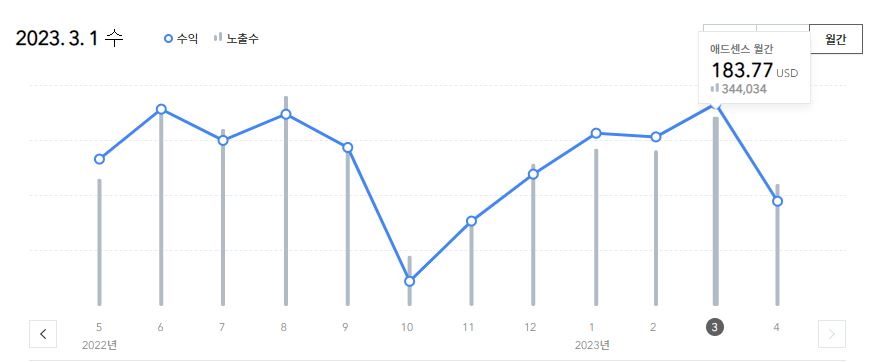 2023년 3월...평타친 블로그 월간 에드센스수익인 183.77달러였습니다 일일 평균 5.93달러