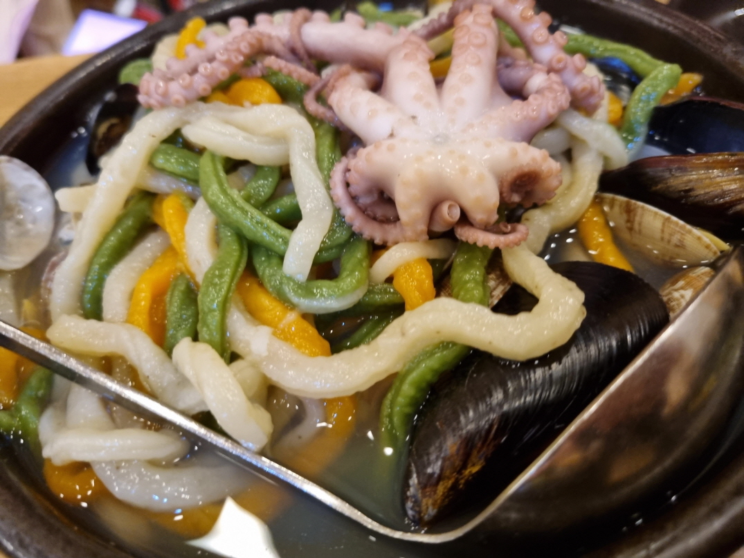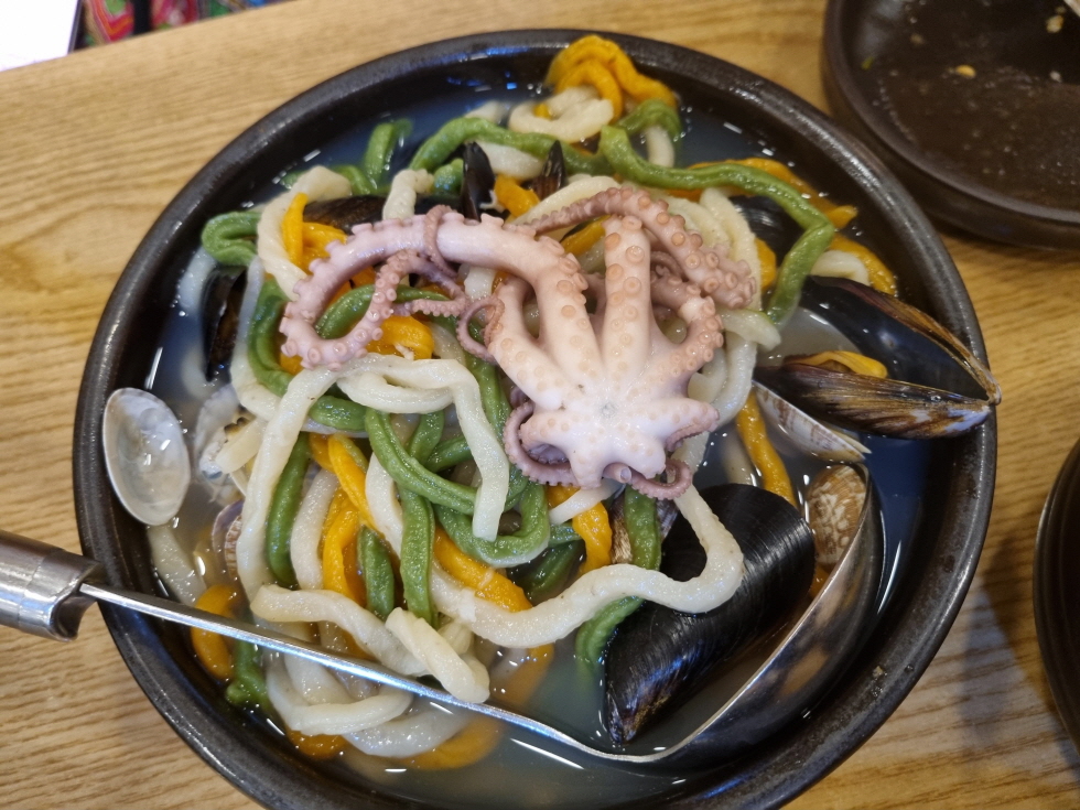 오...1인분 해물칼국수...당근시금치칼국수의 삼색칼국수와 홍합 낙지 바지락등이 들어간 맑은 해물칼국수입니다