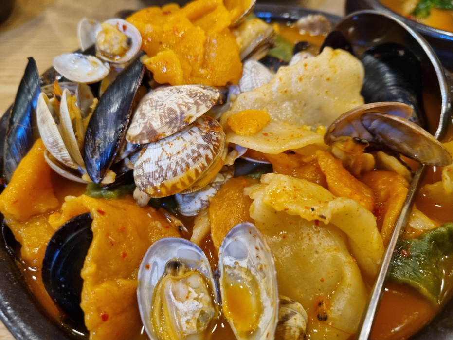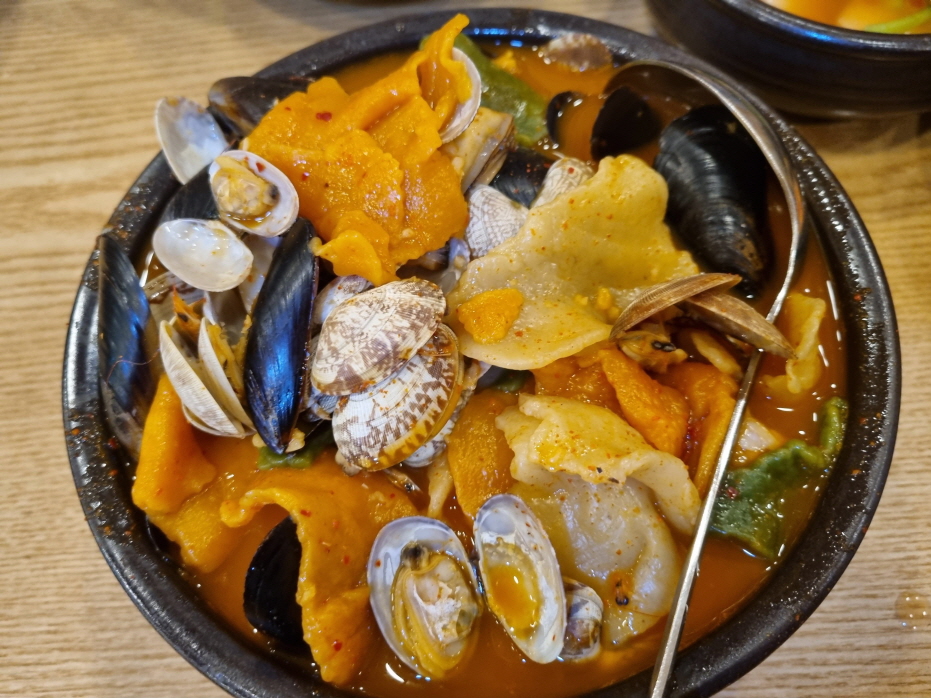 얼큰한 해물국물에 수제비 바지락 홍합 새우등이 들어가서 적당히 칼칼하고 얼큰해서 취향저격이었습니다