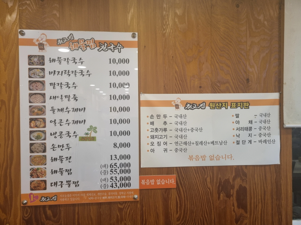 최고집칼국수 원산지 표시판 손만두 배추 돼지고기 쌀 야채 모두 국산 고추가루는 국내산 중국산 섞어쓰고 오징어는 연근해산 칠레산 베트남산 아귀나 서리태콩 낙지는 중국산 절단게는 바레인산을 쓴다고 하네요