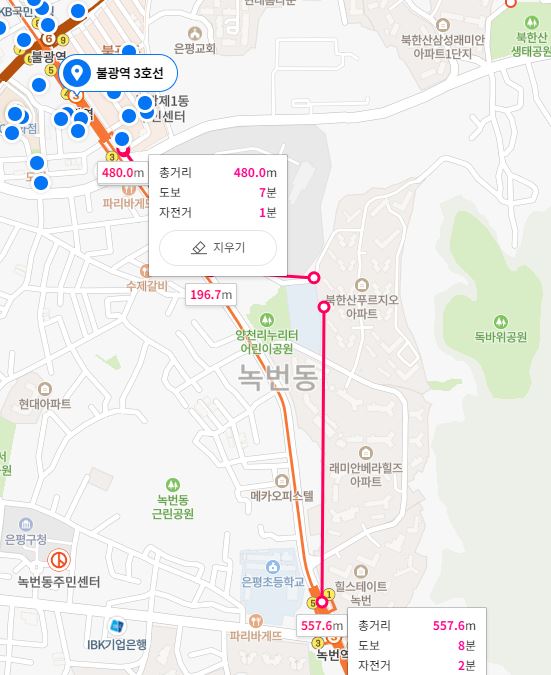 불광역 7분 녹번역8분으로 잡힙니다 여유있게 역에서 10분거리라 생각하면 되겠죠