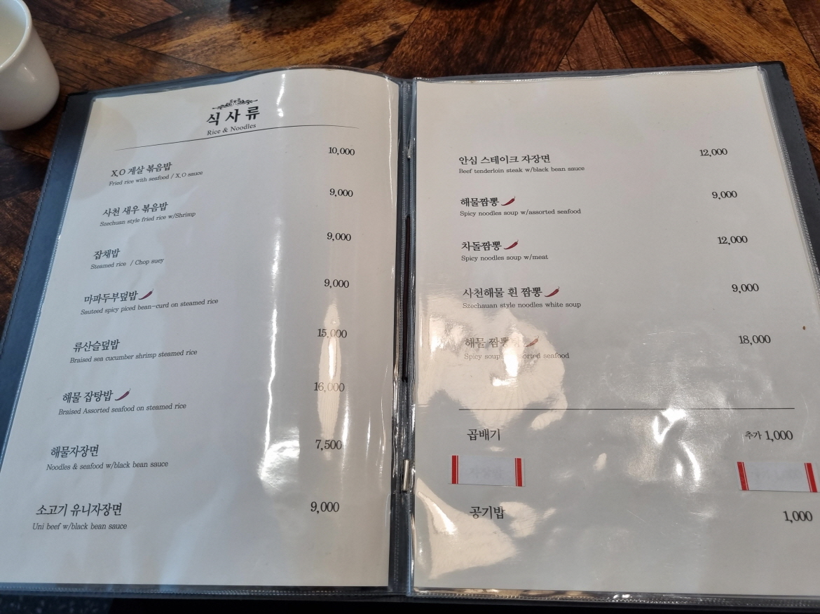 식사류로 Xo게살볶음밥, 사천새우볶음밥, 잡채밥, 마파두부덮밥, 류산슬덮밥, 해물잡탕밥, 해물자장면, 소고기유니자장면, 안심스테이크자장면, 해물짬뽕, 차돌짬뽕, 사천해물 흰짬뽕, 해물짬뽕탕이 있었습니다