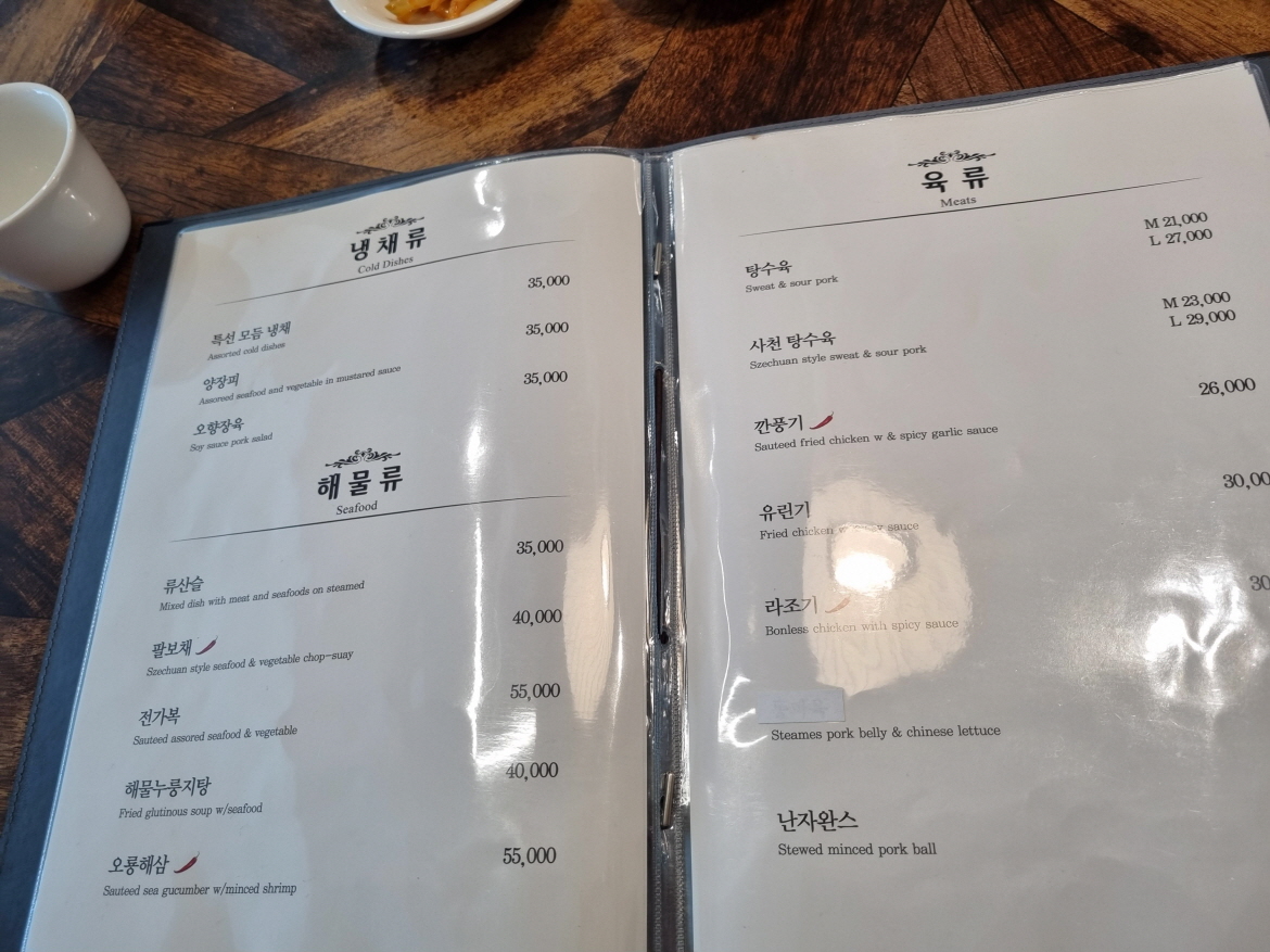 그밖에 메뉴로 특선모듬냉채, 양장피, 오향장육, 류산슬, 팔보채, 전가복, 해물누룽지탕, 오룡해삼, 탕수육, 사천탕수육, 깐풍기, 유린기, 라조기, 난자완스가 있었습니다 무난한 메뉴와 가격구성이네요
