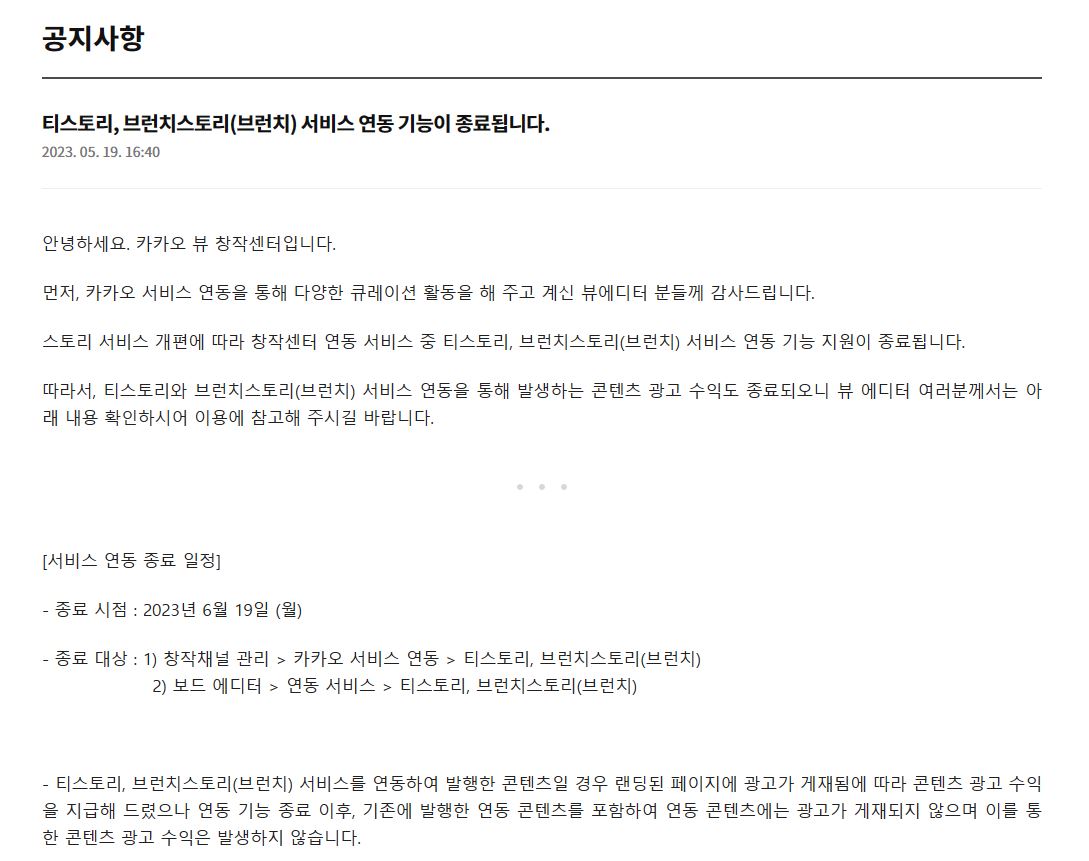 카카오뷰는 2023년 5월19일 공지로 카카오뷰창작센터에서 이제 티스토리와 브런치, 브런치스토리연동 기능지원을 종료한다고 밝혔습니다 솔직히 자회사시스템인 티스토리와 브런치서비스연동을 중지한다는건 카카오뷰서비스를 접겠다는 이야기죠 당연히 그로인해 발생했던 카카오뷰콘텐츠광고수익도 종료된다고 합니다